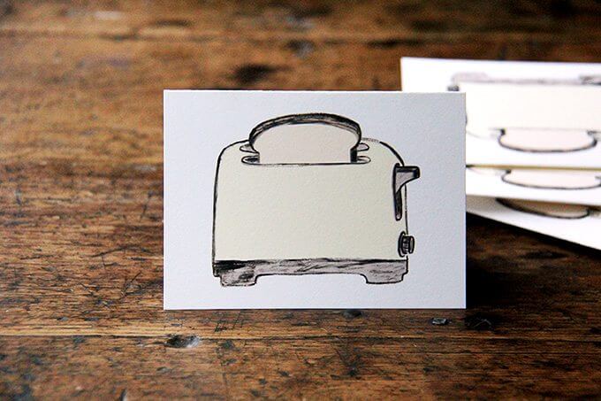 Friends, the notecards and bookplates are here! Aren’t they cute? (See video and photos below). I love Steph’s work. She’s in the process of designing toast + toaster wrapping paper, too. I’ll keep you posted.