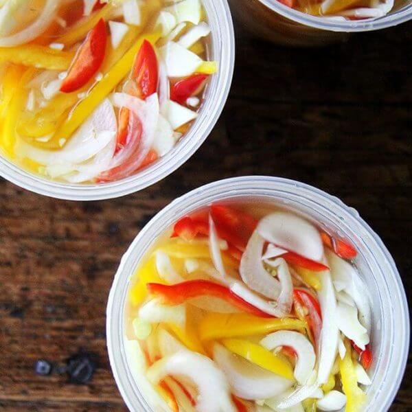- Meanwhile, place the sliced peppers, fennel, onion, garlic, and chili peppers in a large bowl. Pour the pickling liquid over top. Press with a spatula to submerge.
