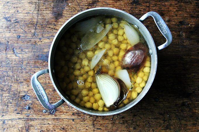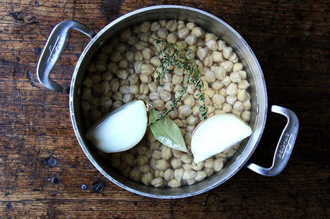 2. Drain and rinse. Place chickpeas/beans in a pot. Cover with water. Add 1.5 teaspoons kosher salt, a few sprigs thyme, a small onion, halved, and a bay leaf. (All of these aromatics are optional.)