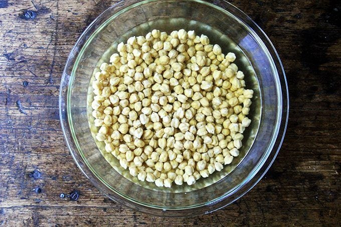 1. Place dried chickpeas or beans in a large bowl and cover with water by at least 3 inches. Stir in 3 tablespoons kosher salt. Stir to dissolve. Let sit overnight or at least 8 to 10 hours.