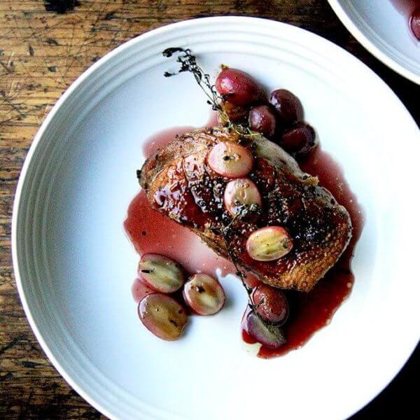 - Transfer breasts to plate, spoon grapes over top. Spoon sauce over top. Top with a small handful of mâche, if using, and serve immediately.