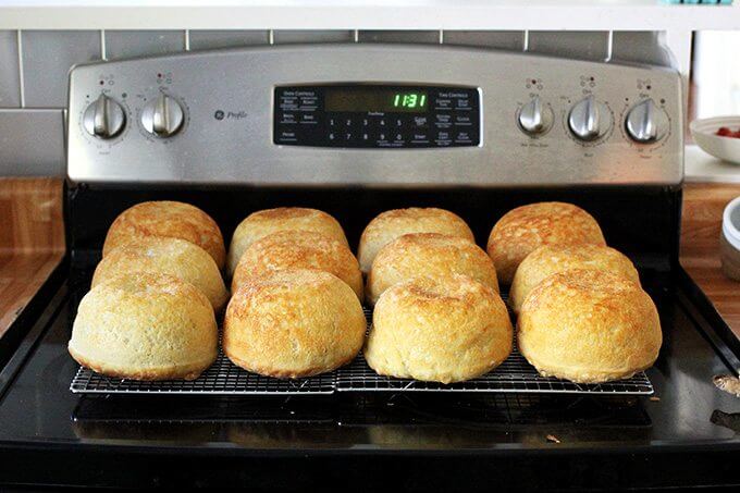 Oh Anne, this makes me so happy! And yes, I did bake 12 loaves at one time … it’s a total pain! I usually do 20 minutes at 425, then rotate the loaves top to bottom, front to back, then, still with the oven at 425 (because the temperature drops so much with so many loaves of bread and during the rotation), I bake for another 15 minutes, at which point the 6 loaves on top are usually done. Then I continue to bake the six on the bottom for another 5 to 10 minutes. Not ideal, but it works!