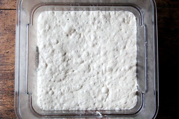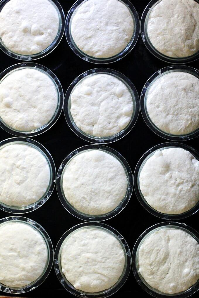 Let rise for 12 to 18 hours, portion into buttered bowls, let rise another 2 hours or until the dough creeps above the rim of the bowl, bake as directed.