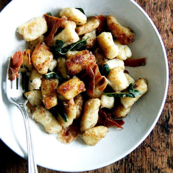 - Let the butter continue to cook until it’s light golden brown and has a nutty aroma. Slide the gnocchi into the pan and, with a rubber spatula, stir gently to coat the gnocchi in butter. Cook without stirring until the gnocchi are heated through and beginning to develop a golden-brown crust on the bottom, about 2 minutes. Crumble the prosciutto into the pan and stir gently with the rubber spatula to combine. Season to taste with salt and pepper, then transfer to a platter and garnish with the fried sage and remaining 1/4 cup grated Parmigiano. Serve immediately.
