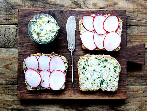 - Assemble the tartines: Spread bread with anchovy butter. Top with thinly sliced radishes or turnips. Season with salt.