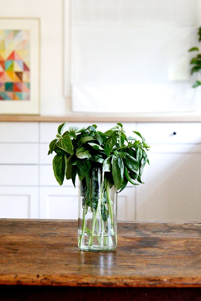 - Basil. We went over this last week, but keeping basil out of the fridge will preserve it longer/better. To store: snip off any rubber bands, cut off the bottom 1/2 inch or so of the stem, transfer it to a water glass or ball jar filled with a small amount of water. See photo above.
