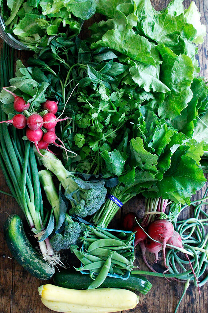 Awash with greens, this week’s CSA share had me turning to some old favorites: shallot vinaigrette for the tender lettuces, pasta carbonara for the broccoli rabe, beet, and radish greens, summer squash spaghetti for the zucchini and squash.