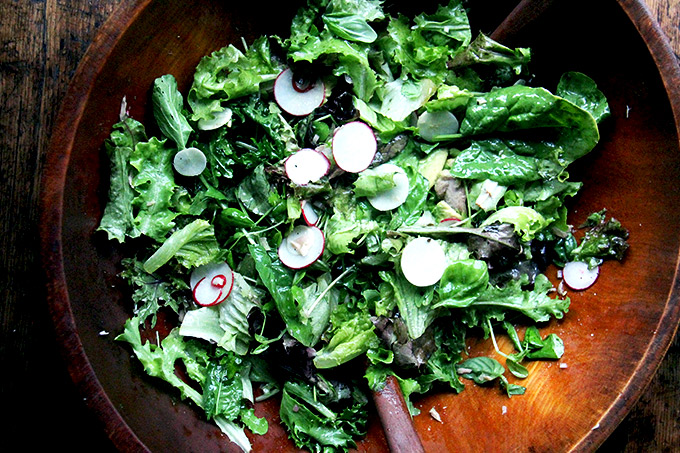 Shallot vinaigrette: With these early shares, we can count on having a simple green salad with shaved radishes, turnips, and scallions twice a week.