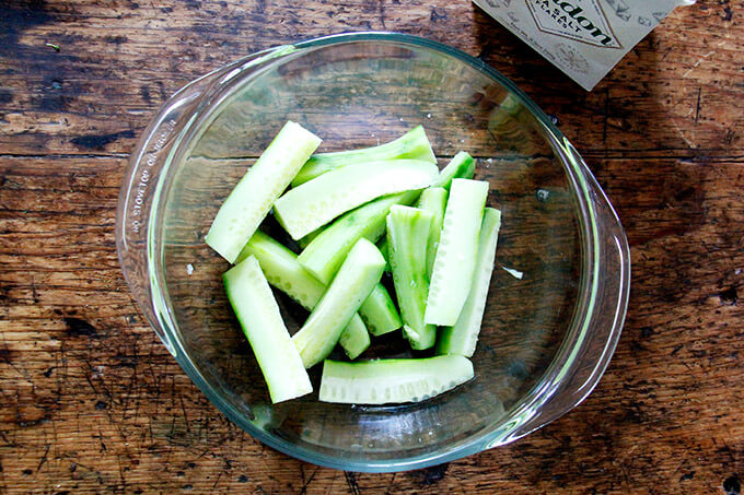 - Cucumbers: Peel (if you wish), cut into spears, salt (something flaky like Maldon is nice here), and stick them in the fridge until you’re ready to serve them. So refreshing and good. Kids typically like them, too.