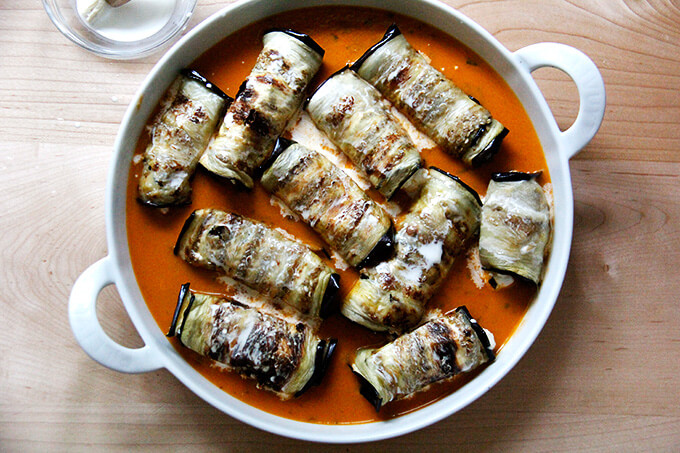 I made your eggplant recipe last night for friends and it was a huge success. The addition of the lemon rind brought a fresh flavor to the ricotta that was so delicious. Baking the eggplants on the parchment enhanced their roasted flavors and kept them light. I added 1/4 cup of grated Parmesan and 1 t. chopped parsley and basil to the ricotta lemon mix. I added a little sick of Mozzarella on top of the eggplant before I rolled them up. Thank you so much for this recipe. I always look forward to seeing what you are making next!