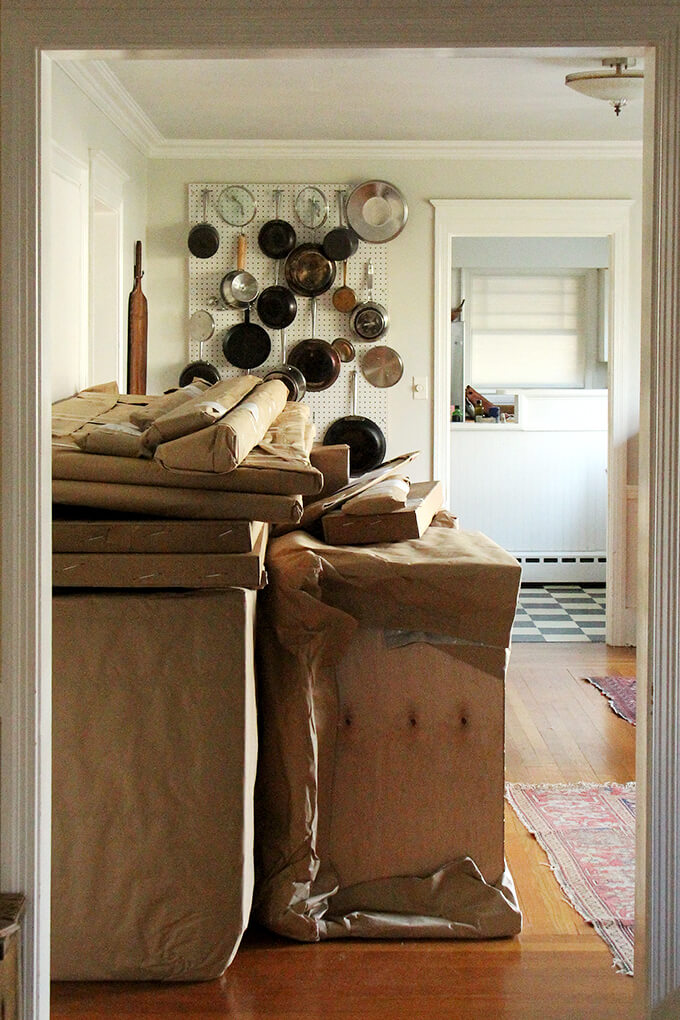 • Get rid of stuff, if you can, or move it. In the months leading up to the renovation, I cleaned out my cabinets, channeling, as best I could, Maria Kondo. It felt really good to give away cooking gear I wasn’t using as well as plates and platters and other things that sat around unused. I also invested in three metal shelving units from Lowe’s, which I set up in the basement—I know having this sort of space is a luxury, but these shelves have been so handy: I use them to store both cooking equipment I don’t use very often as well as pantry items: dried beans, flour, canned tomatoes, spices, granola ingredients, muesli ingredients, etc.