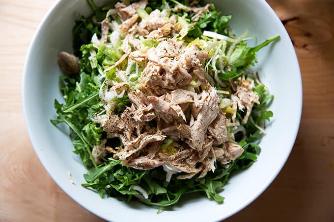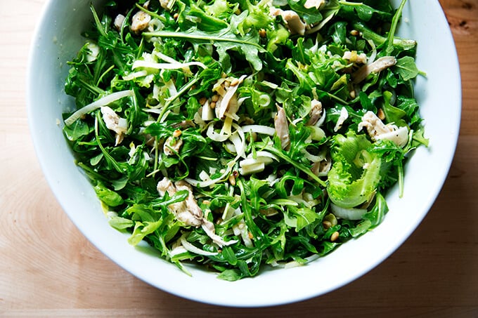 I always feel virtuous when I collect all the leftover odds and ends from the fridge and turn them into another meal. Here, leftover roast chicken bulks up a mix of arugula, sliced endive, and toasted pine nuts. A simple shallot vinaigrette ties it all together, while keeping it light. Fresh or dried fruit would be nice additions here, too, but the key is to use what you have on hand.