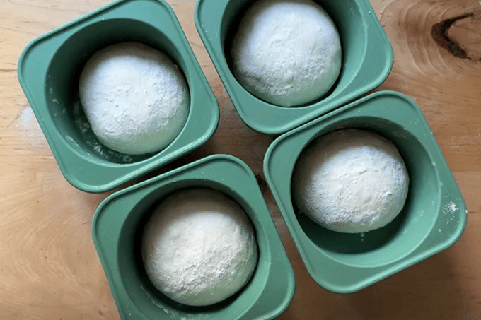 When it’s time to bake, transfer the dough rounds to a lidded vessel such as a DoughMate or a 9×13-inch baking dish covered with plastic wrap (to prevent the dough from drying out), and let the rounds sit for about an hour at room temperature.
