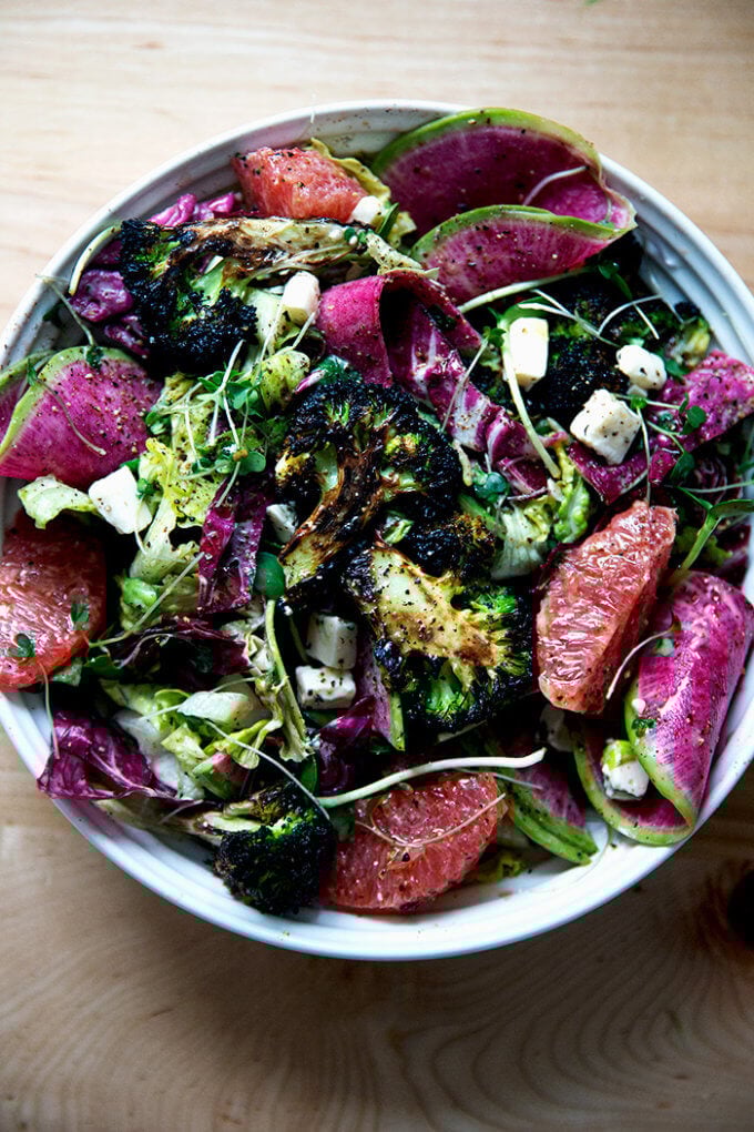 In this Carla Lalli Music recipe, halved broccoli heads sear stovetop for five minutes on one side and one to two on the other. The result is firm stalks with tender, charred florets. When you first taste this salad, you may find it sturdier than you are used to. But as you continue to eat it, which I suggest you do with a fork and knife, I think you’ll find the texture surprisingly nice, a refreshing change from fork-tender broccoli.