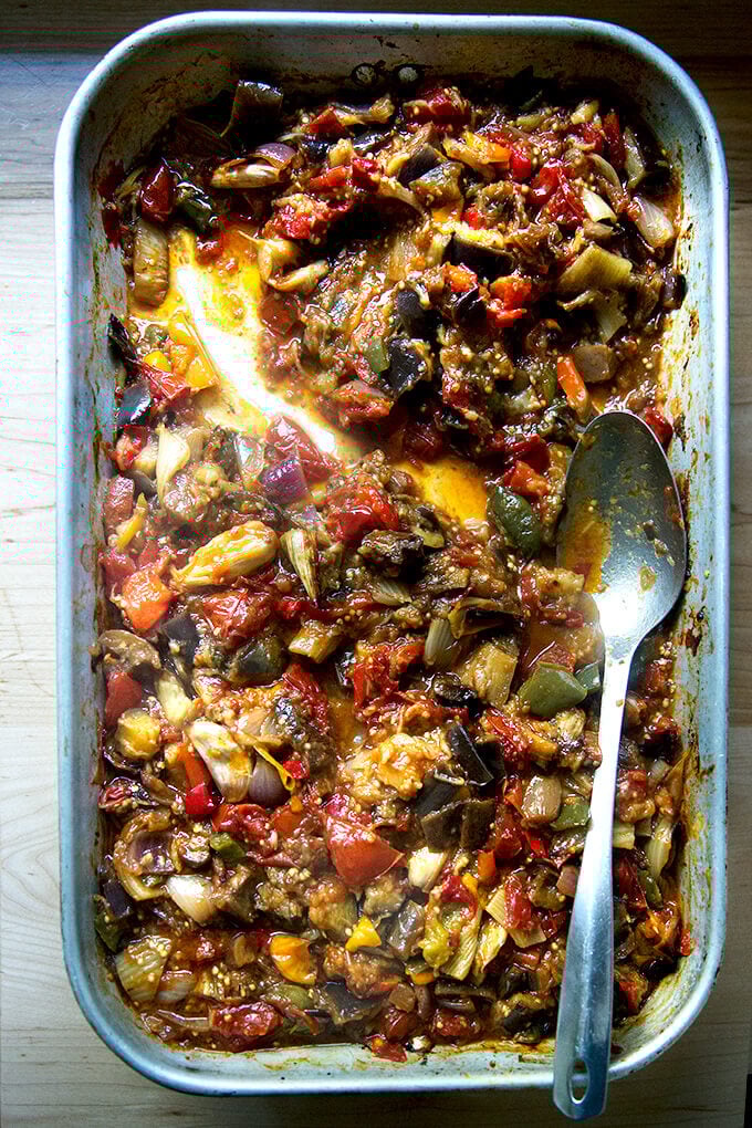 I roasted the cut zucchini and summer squash, with oil and s/p, this morning and left it on the counter before going to work. During the day my beloved and her sisters picked at (ate) the (delicious, they say) roasted raw materials for this dish. I baked what was left per the recipe and it was awesome. So, I have to give this recipe 5 stars even if all of the squash does not make it through the gauntlet of your family-walking-through-the-kitchen, or use the quantities listed in Aliโs recipe.