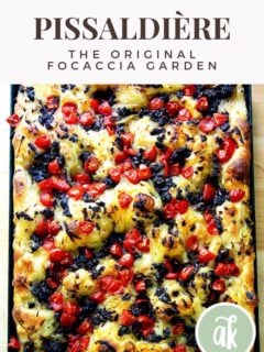 I used a half sheet pan which resulted in a thinner pissaladiere with a crispy crust but never got that beautiful dimpled look. I have a pan that’s somewhere between a 9×13 and a half sheet pan so I’ll try that next time. And there will be a next time! Delicious!