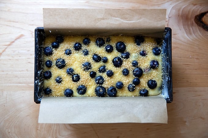 - Scrape the batter into the pan, smooth the top, then arrange the remaining 1/2 cup (72 g) of berries over the top of the loaf, pressing down gently. Lightly sprinkle with turbinado sugar and bake for 60 to 70 minutes, rotating at the halfway point. The cake is done when a wooden skewer inserted into the center comes out with a moist crumb or two. Remove from the oven and let cool in the pan for about 20 minutes. Run a knife around the edges, then lift the cake out by the parchment paper overhang and transfer to a rack. Let cool to room temperature before slicing and serving. Keep the cake, wrapped, on the counter for up to 3 days.