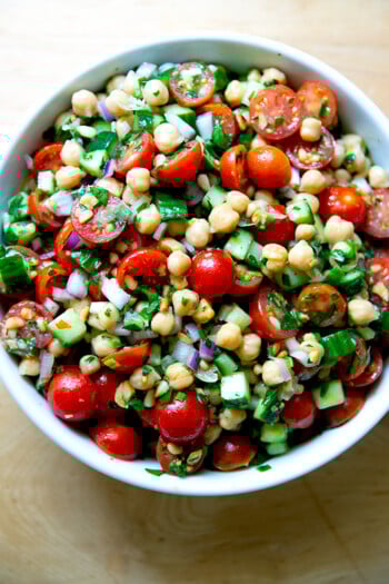 Herby Chickpea Salad with Tomatoes, Cucumbers & Toasted Pine Nuts
